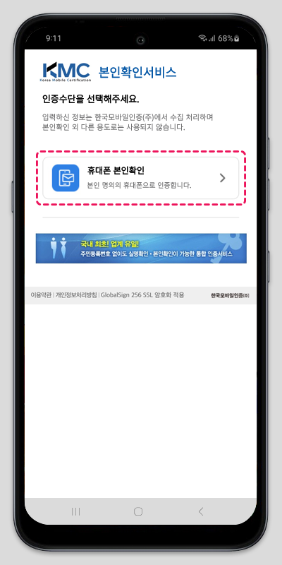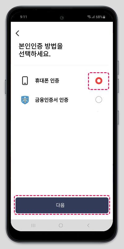 11. 본인인증 방법 선택 창은 휴대전화 인증을 추천해 드리며, 본인 명의로 한 사람당 한 기기만 인증이 가능합니다.