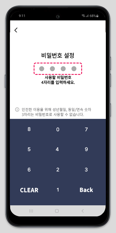 17. 인증을 완료하면 비밀번호를 설정해야 합니다. 비밀번호는 생년월일, 동일 숫자나 연속숫자를 제외한 숫자를 입력하시면 됩니다.