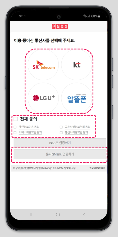 13. 본인이 사용하고 있는 통신사를 선택하신 후 전체 동의, 문자로 인증하기 버튼을 클릭해 주세요.