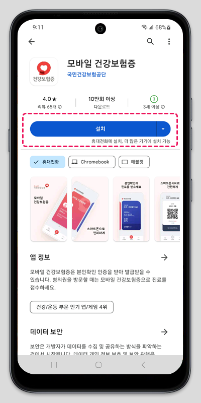1. 이용하고 있는 앱스토어의 검색창에 '모바일 건강보험증'을 입력하여 해당 앱을 설치해 주시면 됩니다.