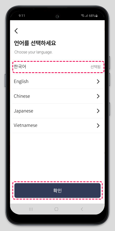 5. 국적에 맞게 언어를 선택하여 주시고 확인 버튼을 눌러 주시면 됩니다.