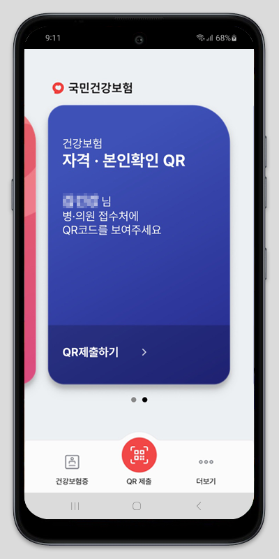 20. 모바일 건강보험증의 발급이 완료되었습니다. 하단에 건강보험증 버튼을 클릭하면 모바일 건강보험증을 확인하실 수 있습니다. 하단 중앙에 위치한 동그란 QR 제출 아이콘을 누르면 병 ·의원의 접수처에 QR코드를 제시할 수 있습니다.