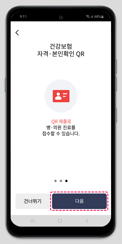 6. 개인정보 보호 안내문, 건강보험 조회, QR 제출 안내문을 확인하셨다면 다음 버튼을 눌러 주시면 됩니다.