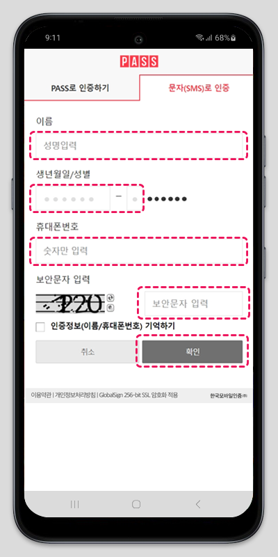 본인이 PASS에 가입이 돼 있으시면 PASS로 인증하셔도 되십니다.