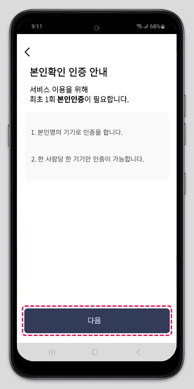 10. 본인 확인 절차 안내문을 확인하셨다면 다음 버튼을 눌러 주시면 됩니다.